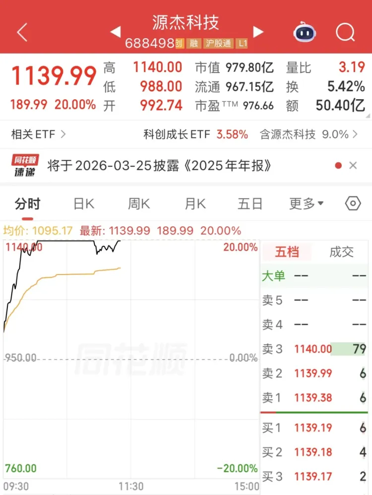 3月20日,光芯片龙头源杰科技盘中股价接连突破1000元、1100元关口,并触及20%涨停,正式迈入“千元股”行列,成为A股历史上第八只千元股。与此同时,公司股价超越寒武纪,跃居A股第二高价股,仅次于“股王”贵州茅台。
