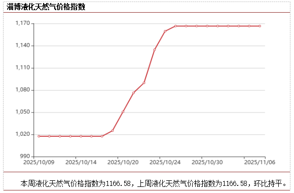 本周管道天然气价格指数为808.72,与上周持平。山东济南、淄博、德州、临沂等地多地因气温骤降提前启动供暖,采暖需求开始释放。中下旬随着采暖需求全面释放,市场需求逐步走高,管道天然气价格或将出现小幅上行。